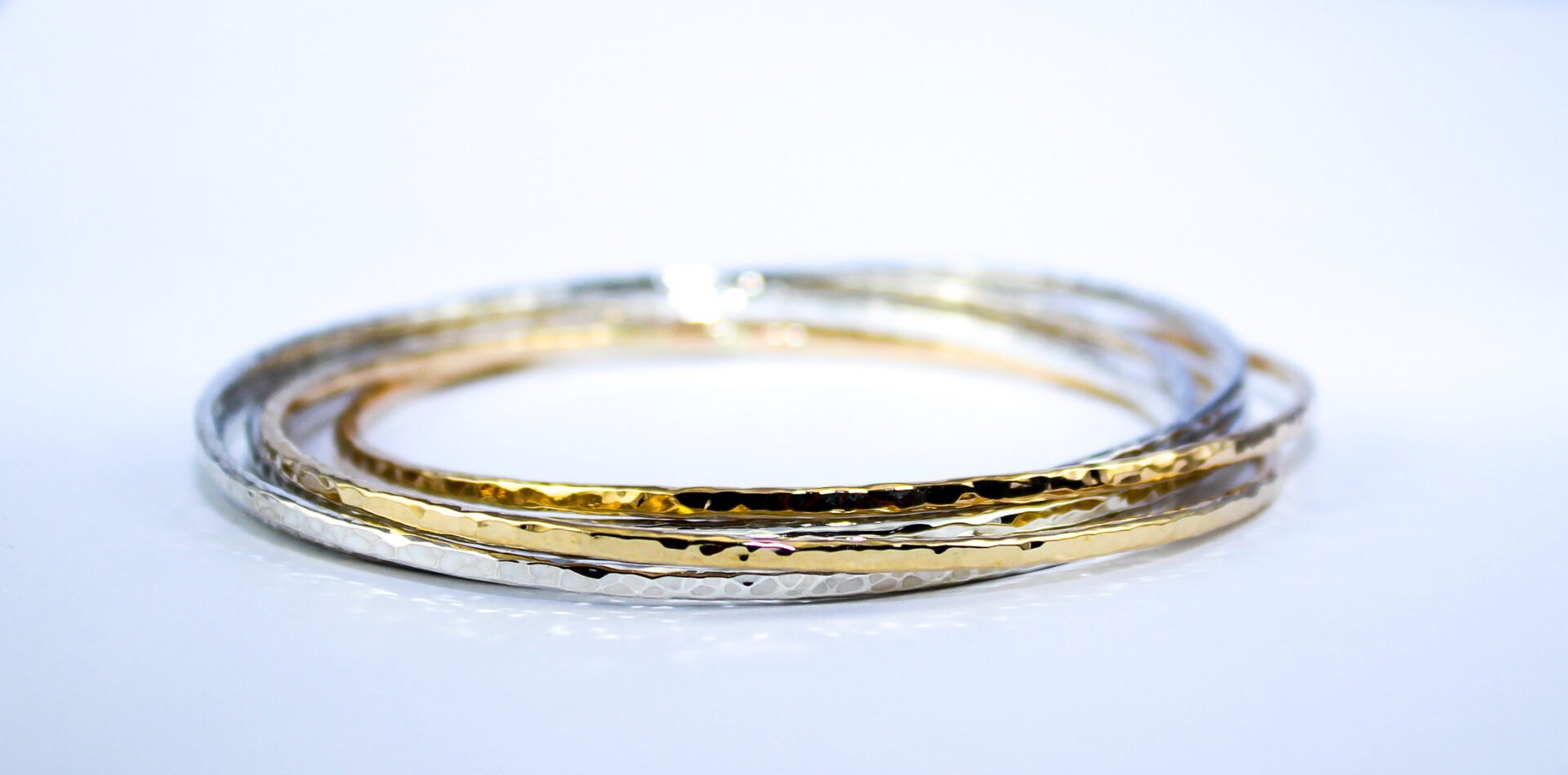 Hand made and hammered in silver and gold. These bangles lock together to make an infinitely wearable piece to complement any outfit or style. Each bangle is handmade from solid silver and gold and linked together in a specific way to create a single piece that is both pleasing to wear and to the eye.