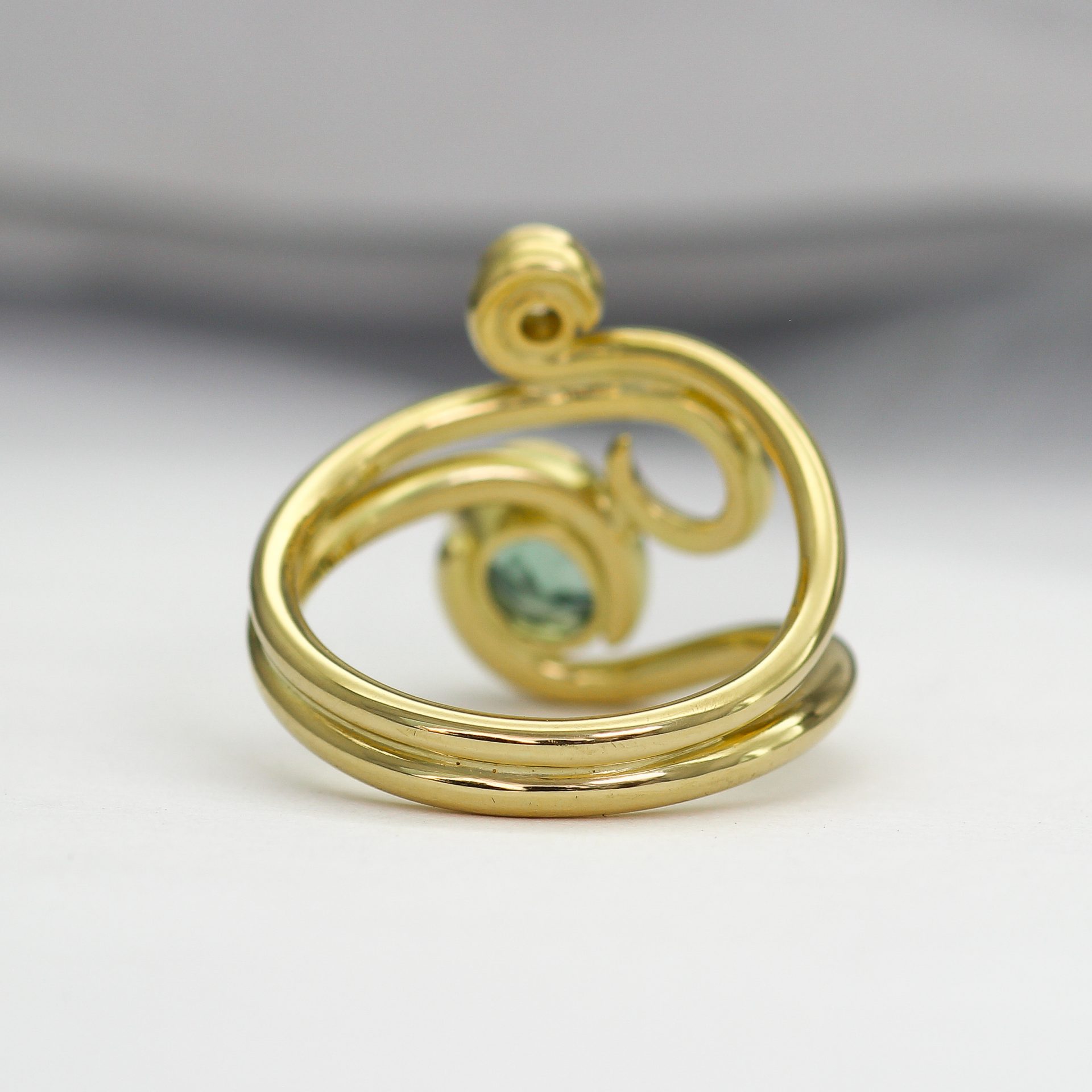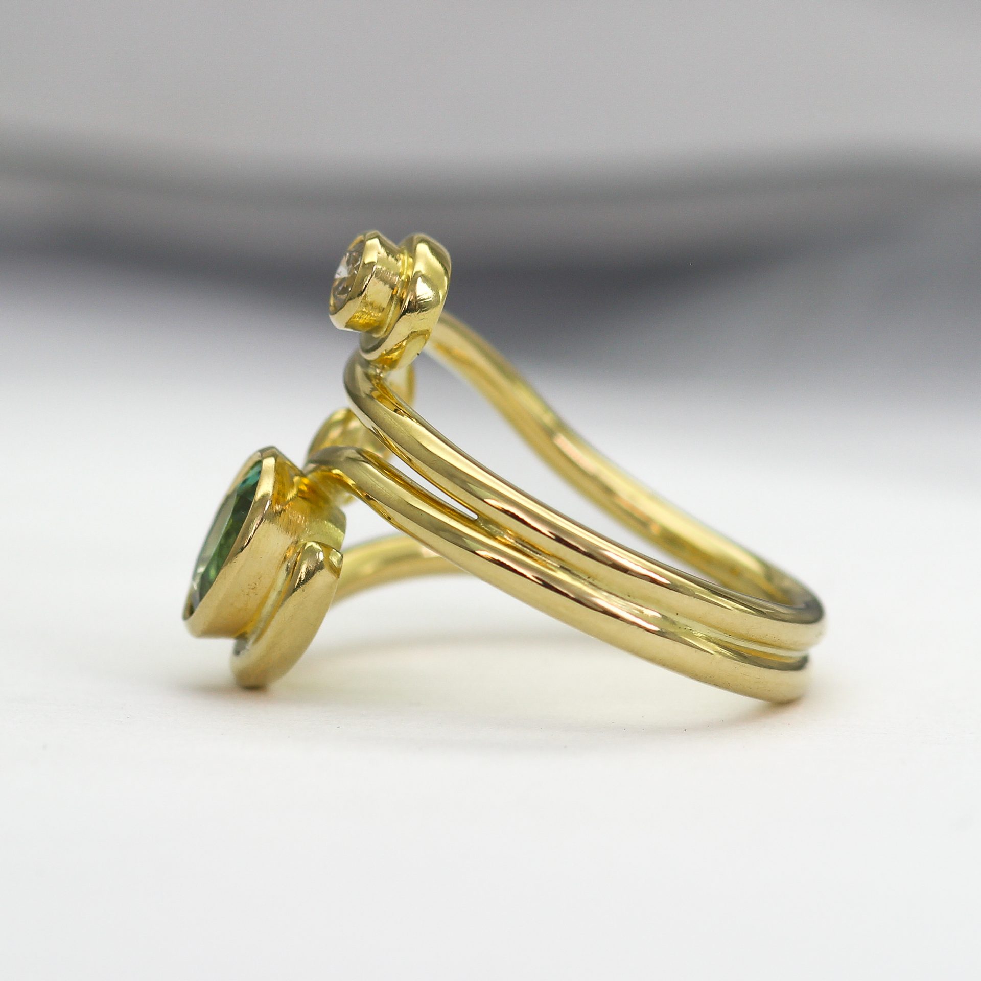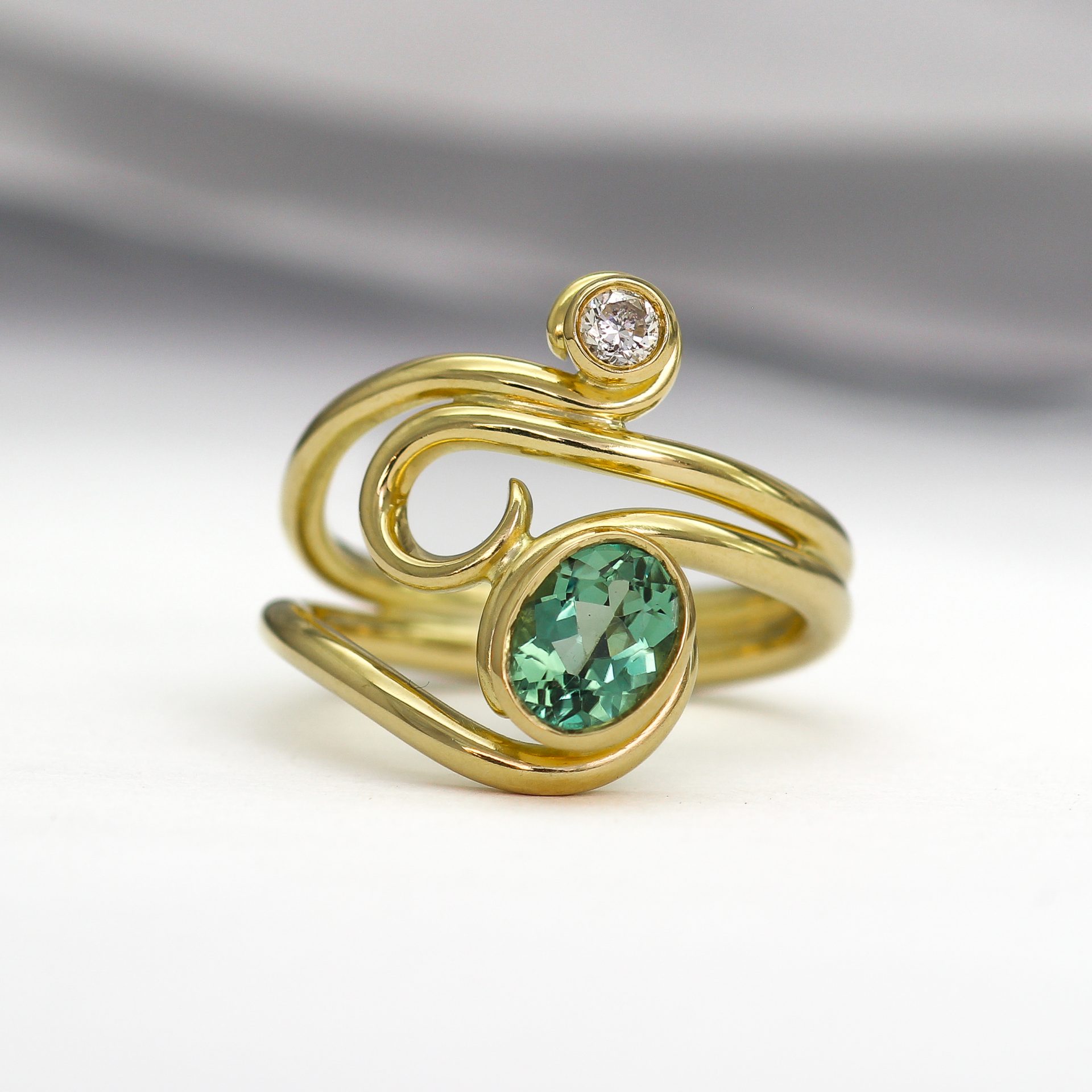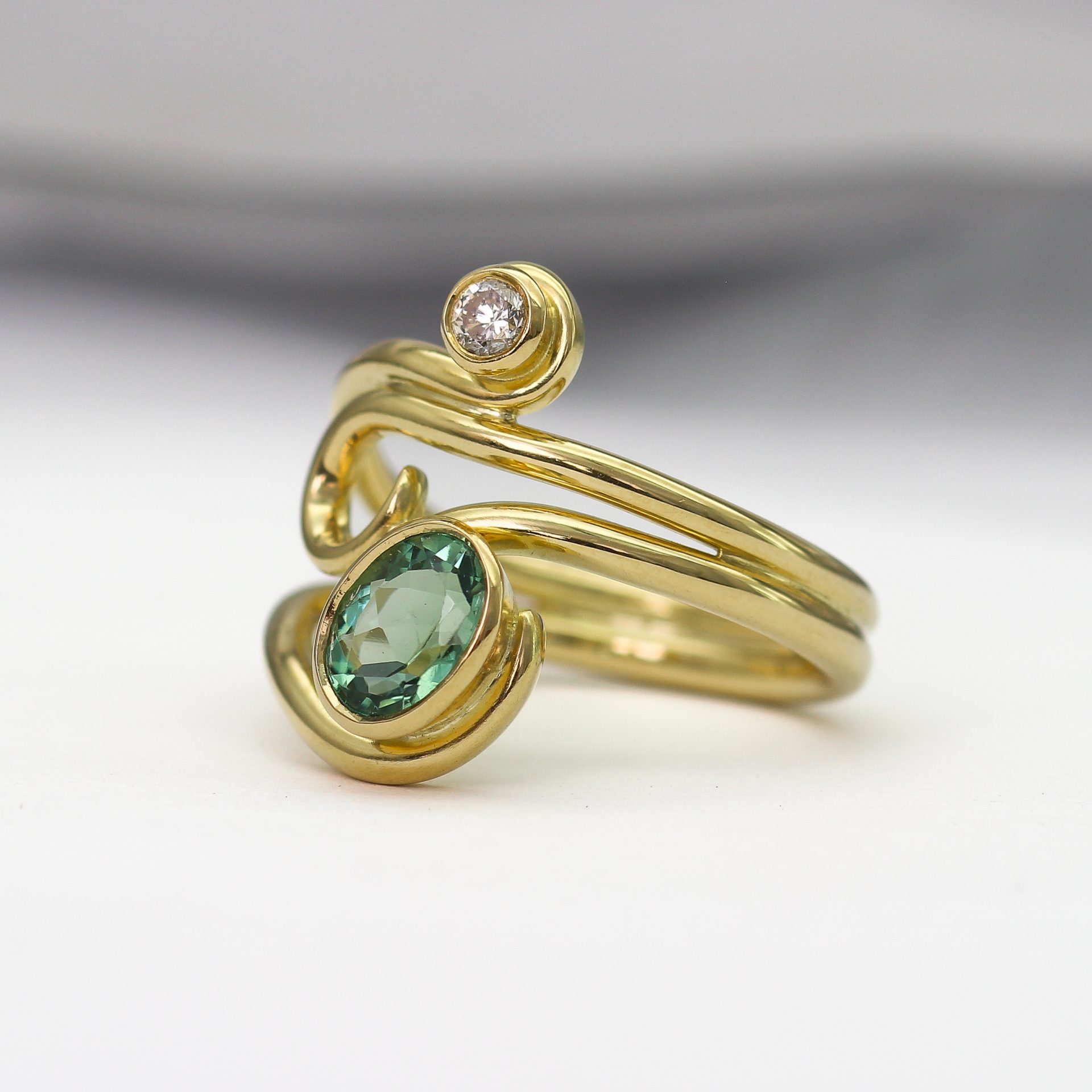 Captivating swirls, curves and a colour pallet of sumptuous gold and delicious greens make this ring appear to be an almost living thing. Coiling strands of gold give the impression of entwining the wearers finger and gemstones. This green of this Tourmaline is rich and vivid in colour. Coupled with a diamond that draws the light, it lifts this ring to a unique level of beauty.